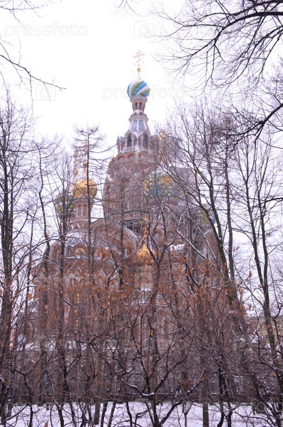 Храм Воскресения Христова на Крови́ (храм Спа́са на Крови́) в Санкт-Петербурге зимой, вид со стороны Михайловского сада