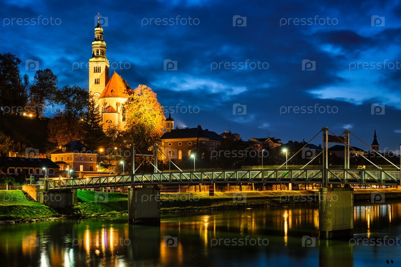 Ночной вид Зальцбурга - церковь Лепросенхаускирхе и мост Мюлльнер Стег, освещенные ночью. Зальцбург, Австрия