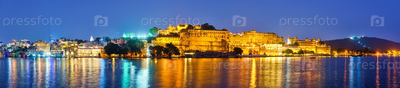Городской дворец Удайпура в вечерней панораме. Удайпур, Индия