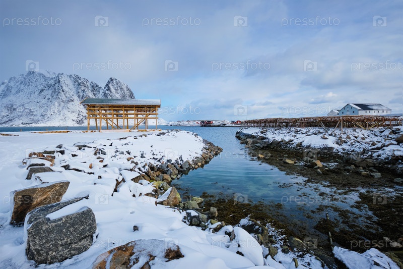 Сушка хлопьев для вяленой трески зимой. Лофотенские острова, Норвегия