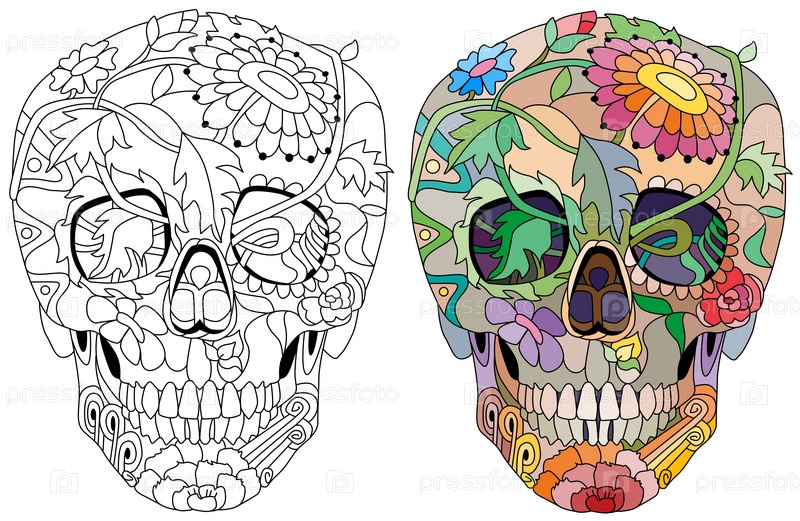 Zentangle стилизованный череп. Ручно нарисованная декоративная векторная иллюстрация для окраски. Набор цветов и контуров
