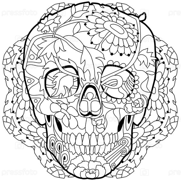 Сахарный череп с цветочным орнаментом для раскраски мандалы