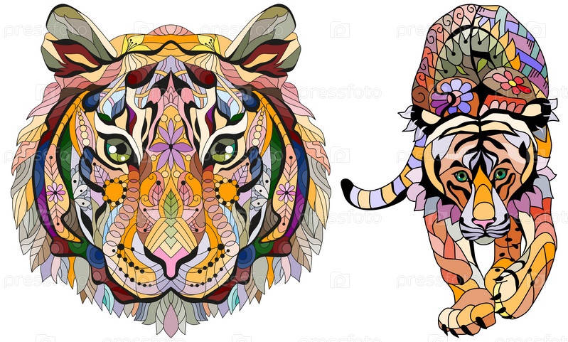 Тигр в стиле zentangle, векторный, иллюстрация, рисунок ручной работы