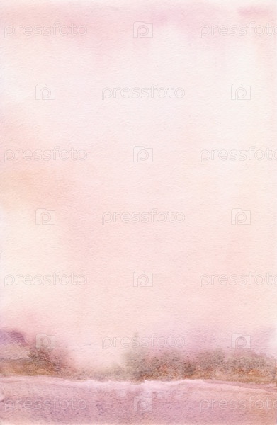 Река и лес в молочно-розовом тумане. Акварельная иллюстрация