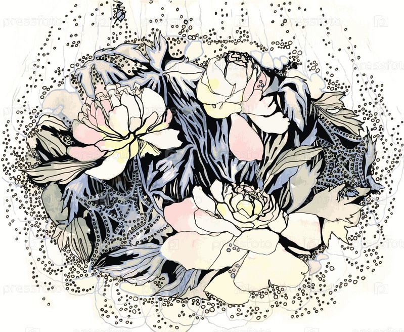 Элегантная цветочная композиция. Легкие воздушные линии и мелкие детали. Нарисовано гелевой ручкой и раскрашено акварелью