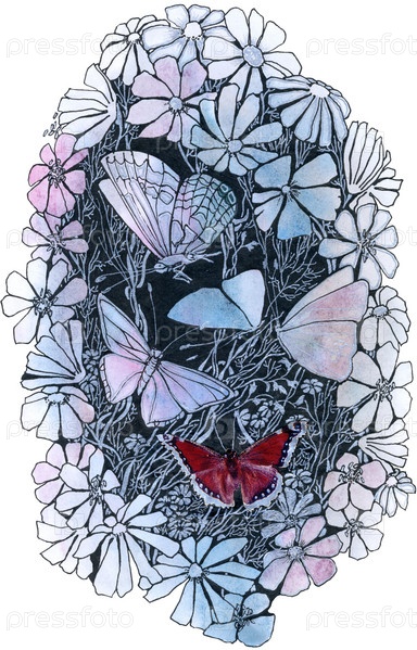 Элегантная цветочная композиция из линейных цветов и листьев. Нарисованные от руки цветы с бабочками. Дизайн свадебного приглашения, конвертов, шаблона поздравительной открытки. иллюстрация