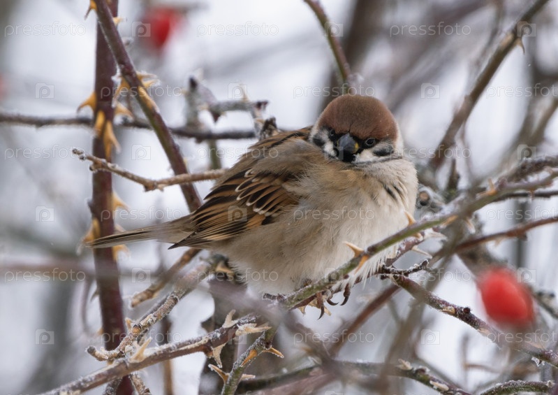 Замерзший воробей на ветвях дикой розы среди красных ягод шиповника, покрытых снегом в холодный зимний день