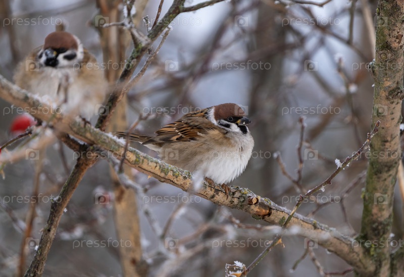 В сильный мороз воробей распушает перья и прячет клюв под крыло, чтобы согреться морозной зимой