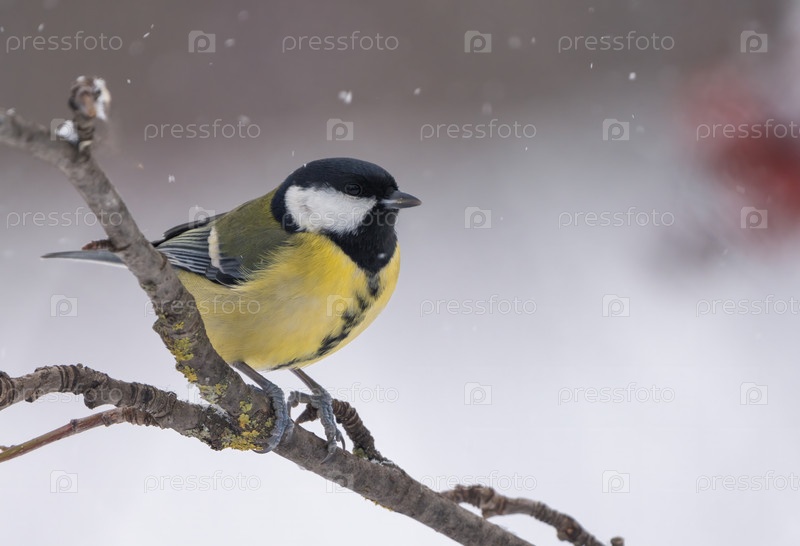 Крупный план синицы, сидящей на ветке красной рябины во время снегопада