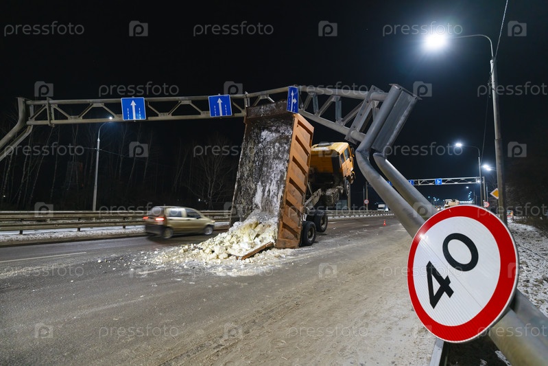 Авария на дороге, большой грузовик зацепился корпусом за металлическую опору и встал на дыбы на двух задних колесах