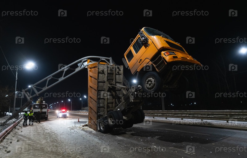 Авария на дороге, большой грузовик зацепился кузовом за металлическую опору и встал на дыбы на двух задних колесах