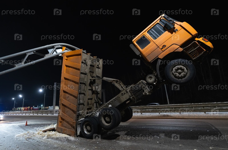 Авария на дороге, большой грузовик зацепился кузовом за металлическую опору и встал на дыбы на двух задних колесах