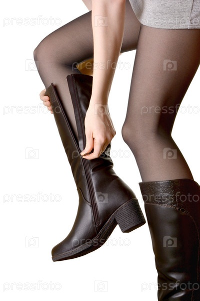 Девушка одевает сапоги на белом фоне