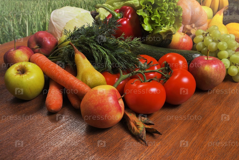 Различные свежие овощи и фрукты на деревянном дубовом столе