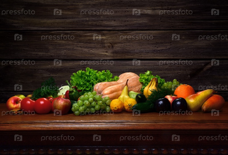 Овощи и фрукты на дубовом столе и на деревянном фоне