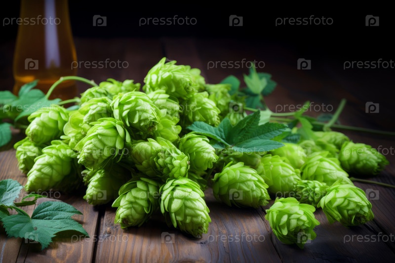Ингредиенты для пивоварения, хмель на деревянном потрескавшемся старом столе перед плантацией хмеля