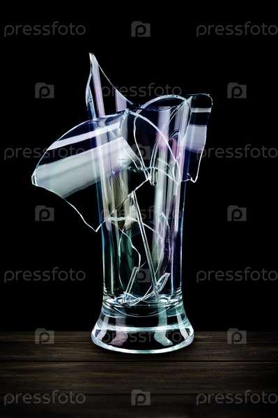 Разбитый бокал с острыми краями на деревянном столе