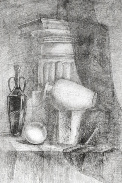 Карандашный рисунок на бумаге. Черновая история. Кувшин на ткани возле столба