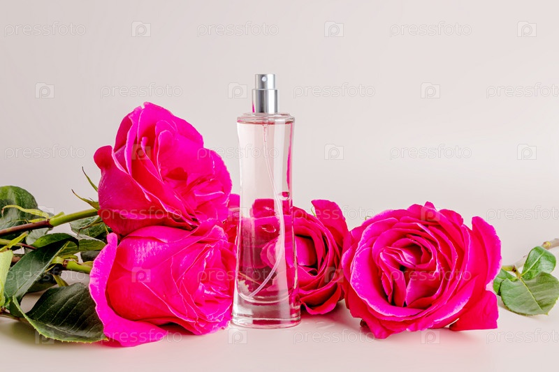 Элегантный флакон женских духов или туалетной воды на фоне красной розы. Копировальное пространство. пастель. Презентация нежного аромата духов
