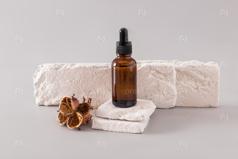 Увлажняющая сыворотка для ухода за кожей лица стоит на кусочках белого кирпича с засушенным цветком. Антивозрастной уход. упаковка, макет