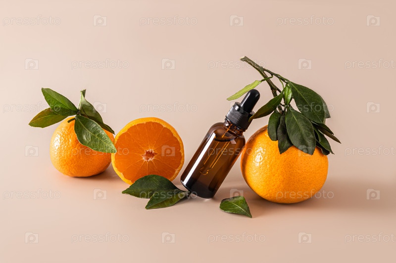 Косметический продукт в бутылке с капельницей среди спелых фруктов мандарины на бежевом фоне Концепция красоты и натуральной косметики Витамин С