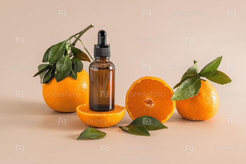 Косметический флакон с капельницей с увлажняющей сывороткой для ухода за кожей лица и тела на основе экстракта мандарина среди спелых фруктов. Макет витамина С