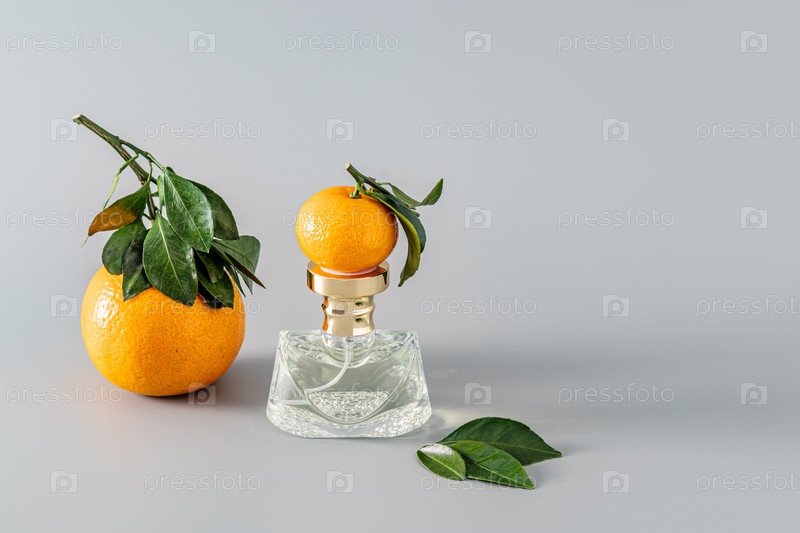 Элегантный хрустальный флакон женских духов с ароматом нежных свежих цитрусовых на сером фоне с плодами мандарина. Презентация