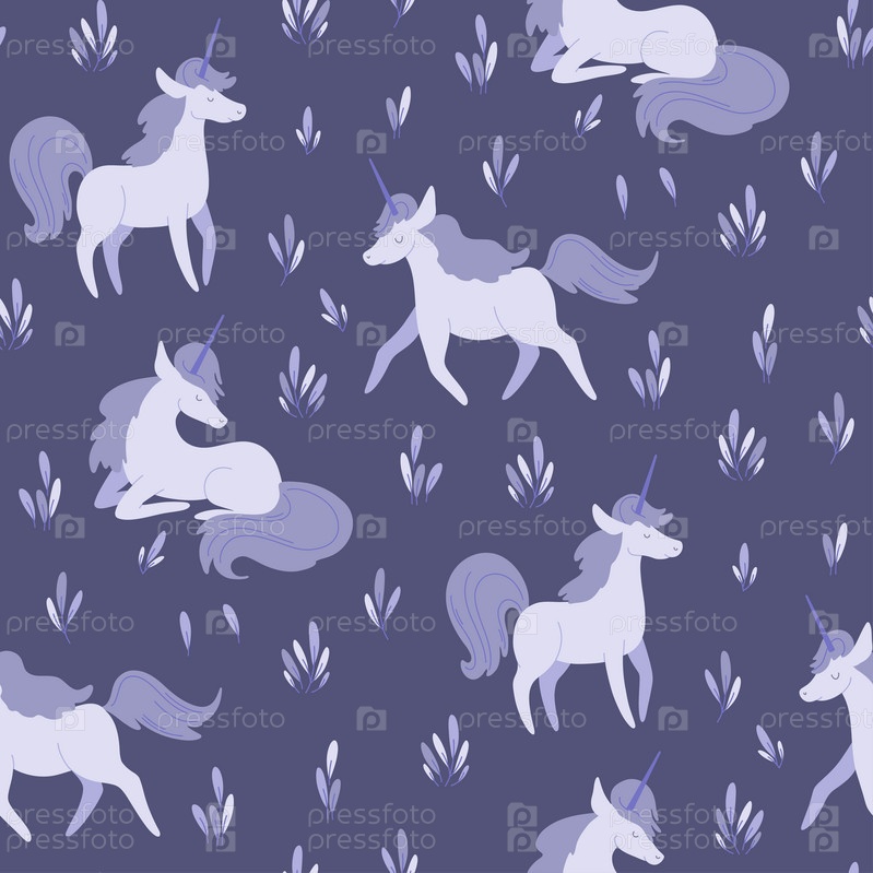 Бесшовный узор волшебных фиолетовых единорогов в лесу