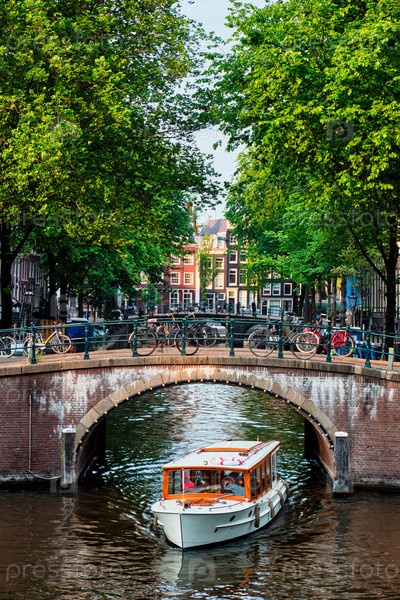 Вид на Амстердам - канал с лодкой, мостом и старыми домами