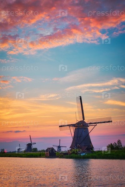 Сельский пейзаж Нидерландов с ветряными мельницами на известном туристическом объекте Киндердейк в Голландии на закате с драматическим небом