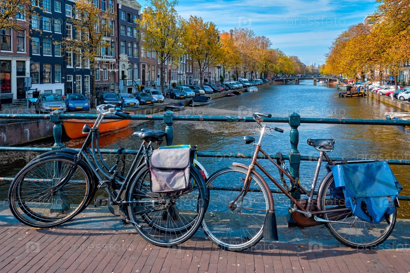 Городской пейзаж Амстердама с каналом, мостом с велосипедами и средневековыми домами. Амстердам, Нидерланды