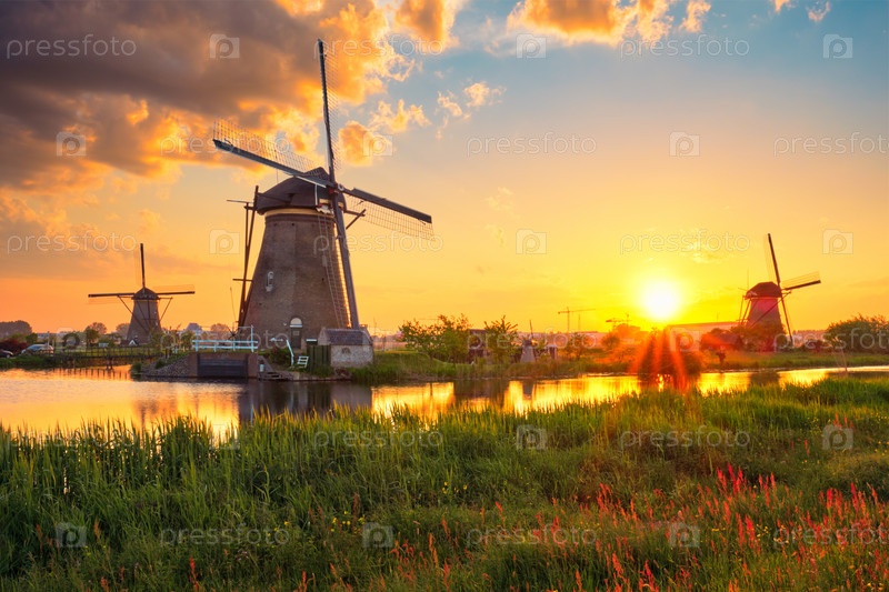 Сельский пейзаж Нидерландов с ветряными мельницами на известном туристическом объекте Киндердейк в Голландии на закате с драматическим небом