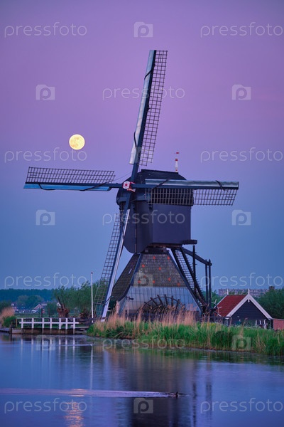Сельский пейзаж Нидерландов с ветряными мельницами на известном туристическом объекте Киндердейк в Голландии в сумерках с полной луной и уткой в канале