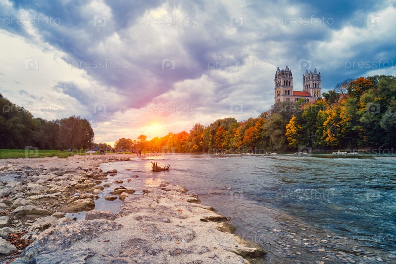 Вид на Мюнхен - река Изар, парк и церковь Святого Максимилиана с моста Райхенбах на закате. Мюнхен, Бавария, Германия