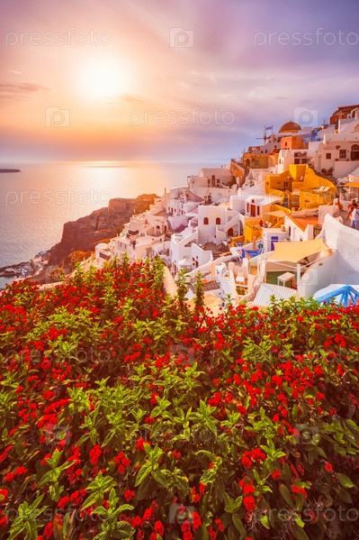 Закат над городом Ия на острове Санторини летом. Санторини, Греция