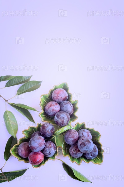 Большие спелые сливы в зеленой керамической посуде
