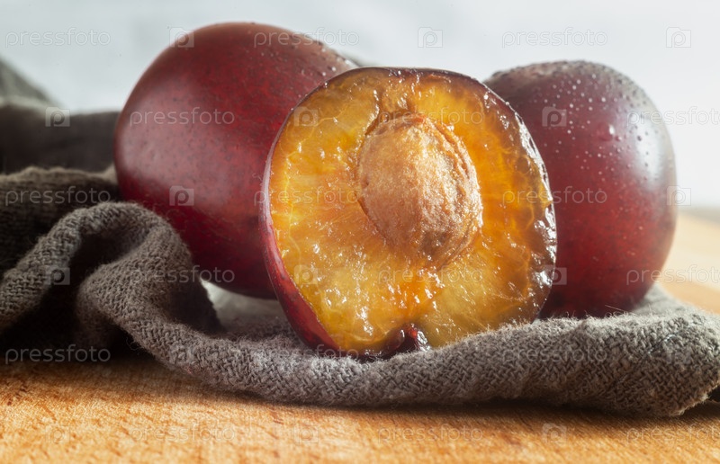 Две спелые сливы и половинка разрезанной сливы с косточкой