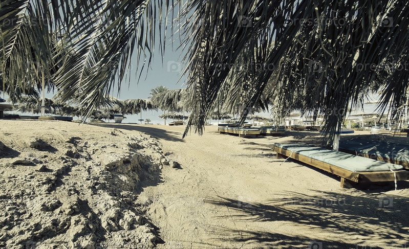 Удобный пляж на пляже с удобными шезлонгами и зонтиками