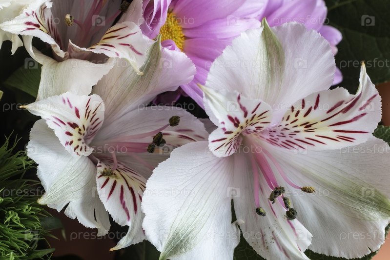 Букет прекрасных цветов амариллиса и хризантем. Представлено крупным планом