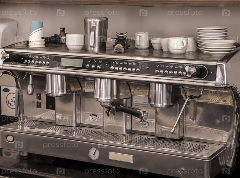 Профессиональное приготовление кофе в кофейне из свежемолотых кофейных зерен в современной профессиональной кофемашине. Передний план