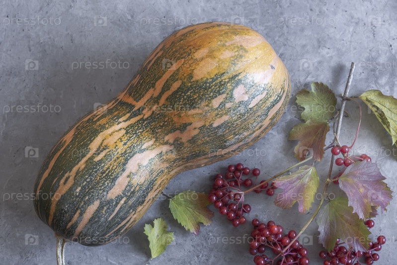 Большая спелая тыква и ягоды калины на столе