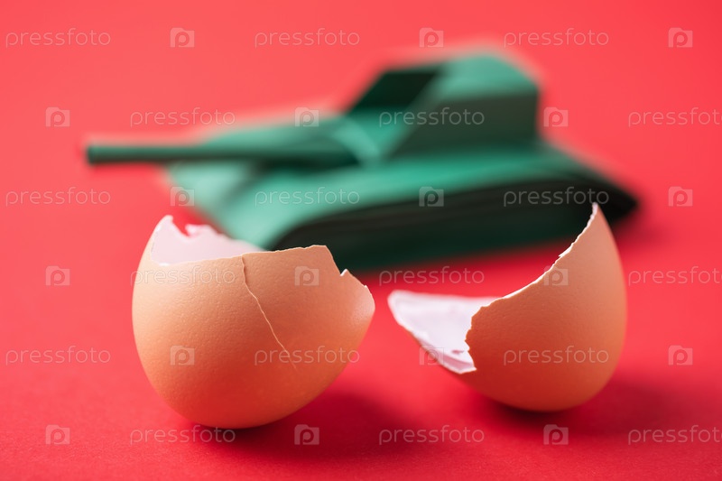 Разбитое яйцо пополам и игрушечный бумажный танк на красном фоне, концепция на тему хрупкого мира