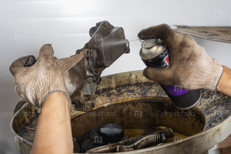 Автомеханик очищает теплообменник легкового автомобиля с помощью чистящего спрея