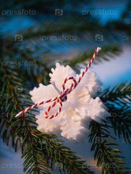 Белая ароматическая свеча в форме снежинки на еловой ветке, крупный план