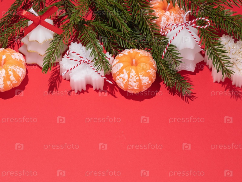 Вид сверху на различные ароматические свечи с еловыми ветками на красном фоне и пространство для копирования внизу