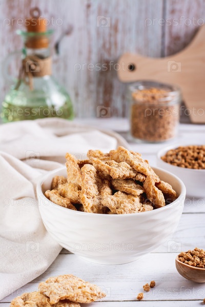 Сухие обезвоженные соевые стейки и соевый фарш в мисках на столе, вертикальный вид