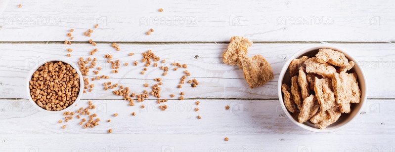 Альтернативное протеиновое сухое соевое мясо в миске на столе, вид веб-баннера