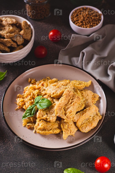 Альтернативное соевое мясо с рисом на тарелке на столе, вертикальный вид