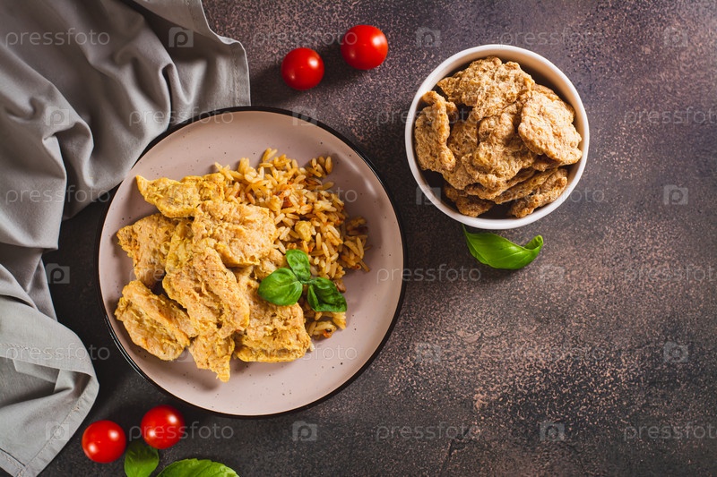 Вегетарианское блюдо, тушеные соевые стейки с рисом на тарелке на столе, вид