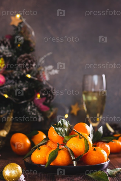 Целые мандарины с листьями на тарелке на столе в рождественских украшениях, вертикальный вид